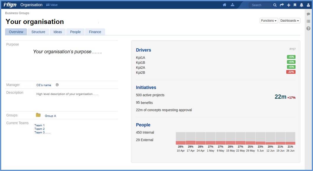 Organisation Dashboards will be replaced by an Organisation Overview. This will take you to your highest level Business Group, which contains the view of your organisation as a whole. See below for a mock-up of the screens which are likely to change. Existing information not included in the new tabs will be available under the Dashboards dropdown box. Other likely changes include being able to link individual projects to Strategic Drivers and replacing current Strategic Folders with Categories.