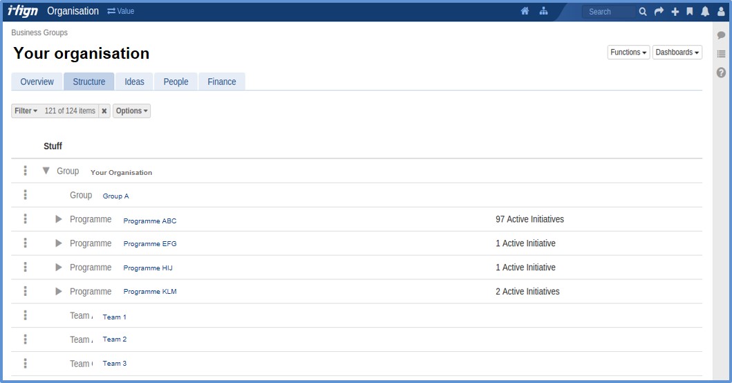 This new tab will provide you with a view of all of all your initiatives, business groups and teams in one place. It will replace current hierarchical views of this information such as the Programme List and the Business Groups >Structural Teams tab. See below for a mock-up of this screen
